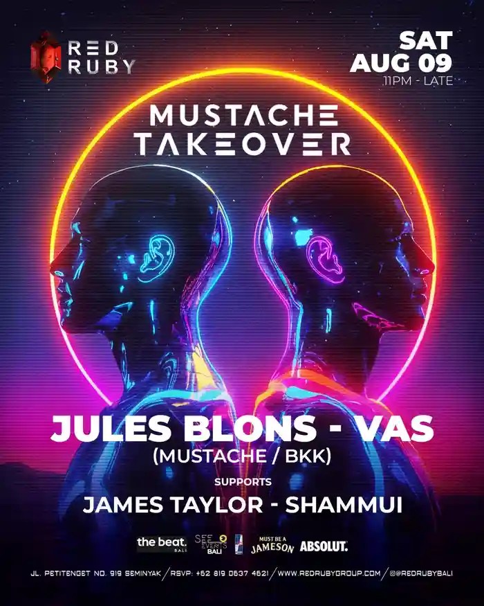 𝗦𝗔𝗧 • 𝗔𝗨𝗚 • 𝟵 , Red Ruby presents : // 𝐌𝐔𝐒𝐓𝐀𝐂𝐇𝐄 𝐓𝐀𝐊𝐄𝐎𝐕𝐄𝐑 [𝐁𝐊𝐊] // 👇 𝗧𝗜𝗫 & 𝗦𝗢𝗙𝗔 👇 USE CODE THEBEATBALI FOR YOUR