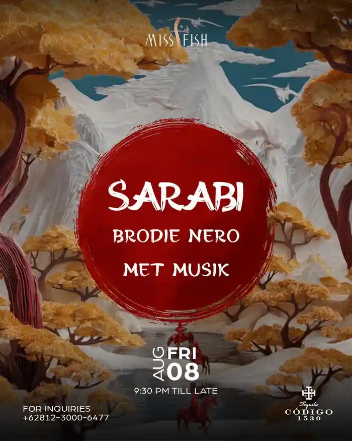 Step into the wild pulse of SARABI this Friday, August 8 at Miss Fish Let the night roar with powerful sounds by Brodie Nero &