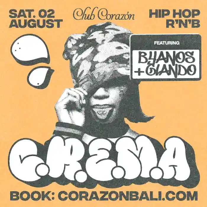 CLUB CORAZON PRESENTS C.R.E.M.A Hip Hop + R’n’B every Saturday! Featuring Byanos & Glando. If you’re in Uluwatu and is into Hip Hop and R’n’B,
