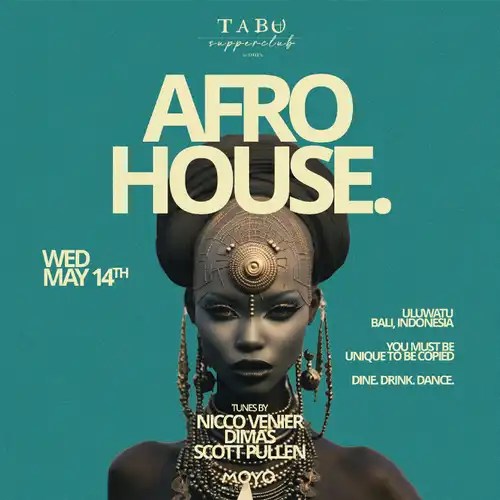 Moyo presents AFRO HOUSE Nicco Veneer Dimas Scott Pullen GET ready for a pumped up Wednesday night’s party at the place to be in Uluwatu.